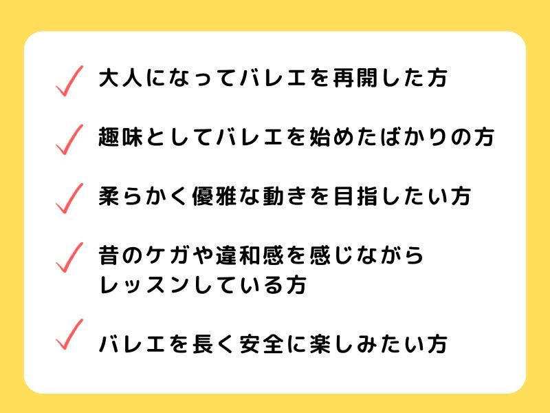 大人バレエに必要な体のバランス・しなやかさは、日々のストレッチだけでは手に入らないこともあります。